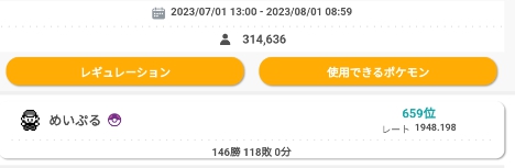 【ポケモンSV S8ランクマ】レギュD(?)氷統一最高1948.198(659位) 最終1846.232 (1,738位) 8/2 一番下に補足。